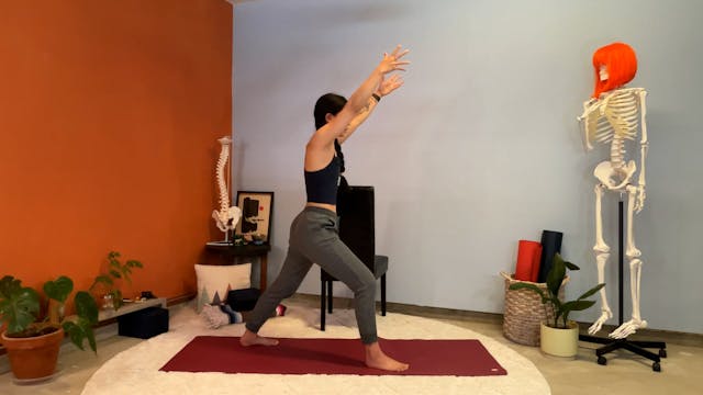 This beginner-friendly practice incorporates arm & upper body variations in Virabhadrasana I & II (Warrior 1 & 2). Recommended props: 1 blanket, 1 block.