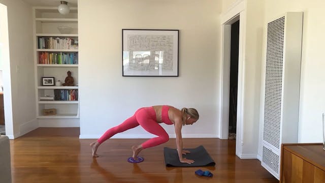 Join Maya for a quick full body workout to tone the arms, legs, glutes and core. Exercises include: arms without weights, standing legs with a gliding disc, plank abs, side booty, abs on back, and more. Recommended equipment: gliding disc, resistance band