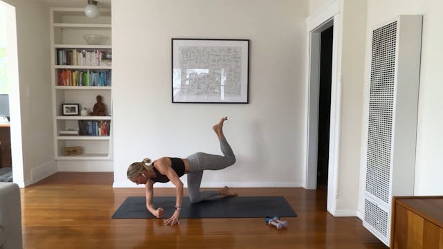 Join Maya for a quick full-body workout with no props required! Exercises include: arms without weights, standing legs, plank variations, side booty, c-curve abs, and more! Optional equipment: light hand or wrist weights, Pilates ball or small pillow