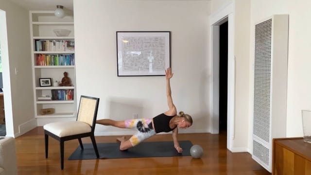 Join Maya for a quick full-body workout that gets it all in! Exercises include: arms without weights, standing legs, push-ups, plank work, C-curve abs, and more. Recommended equipment: chair or stool, Pilates ball