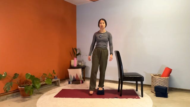 Let's keep working on single leg balance (mindfully, of course). Recommended props: 1 block, optional props: 1 chair or something to assist with balance.