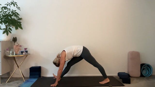 LOTS of choices: move a LOT and challenge yourself OR take the easier variations. Sun salutations galore, core when you least expect it, plenty of standing poses and 2 big twists. Backbends and inversions and arm balances offered at the 45 min mark OR gentle standing folds. We end with seated twi...